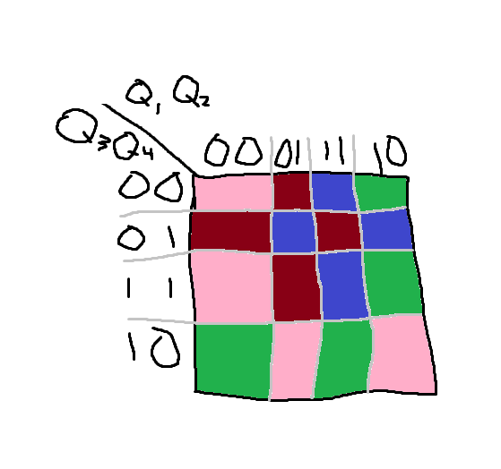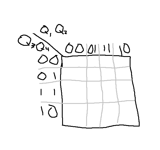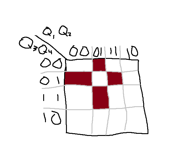 Then each square represents a set of four answers, one for each of questions Q1, Q2, Q3, and Q4. The column decides the answers to Q1 and Q2. The row decides the answers to Q3 and Q4. I’m using “1” for “yes” and “0” for “no.” The columns and rows are numbered in grey code, which means that moving one square in any direction is equivalent to flipping one Y/N answer. Because there are 4 answers to flip, and 4 directions to move in (you can move left on the leftmost square to end up on the rightmost, same with top and bottom. Like the Asteroids video game), every answer-flip is represented by a move of one square in a particular direction.
