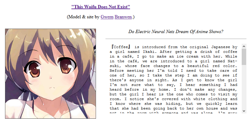 A StyleGAN-based synthetic anime-style female face generator also recently went viral, and its bright and colourful (and royalty-free) anime faces have been popping up everywhere on social media. Independent researcher Gwern Branwen developed “This Waifu Does Not Exist,” a simple static website with 70,000 random StyleGAN faces and 70,000 random GPT-2-small text snippets generated using a random seed 1–70,000 and a long prompt with anime-related words and phrases picked by Branwen.