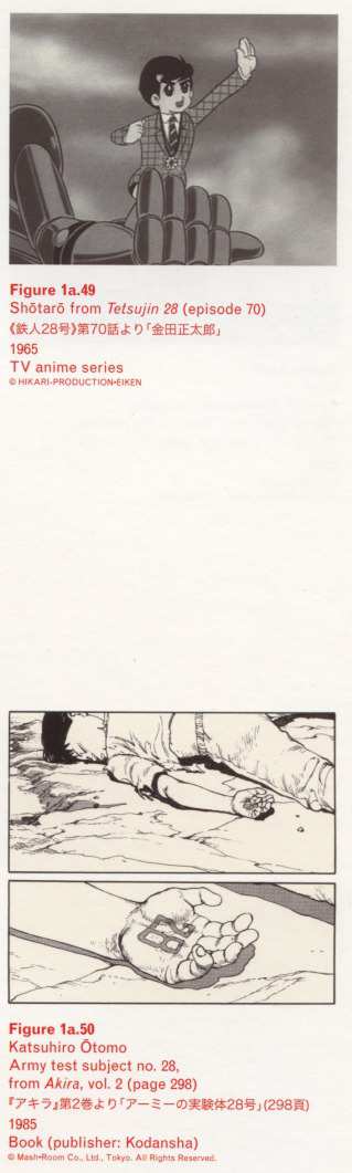Caption right top: • Figure 1a.49 • Shōtarō from Tetsujin 28 (episode 70) • 196560ya • TV anime series • Caption right bottom: • Figure 1a.50 • Katsuhiro Ōtomo • Army test subject no. 28, from Akira, vol. 2 (page 298) • 198540ya • Book (publisher: Kodansha)