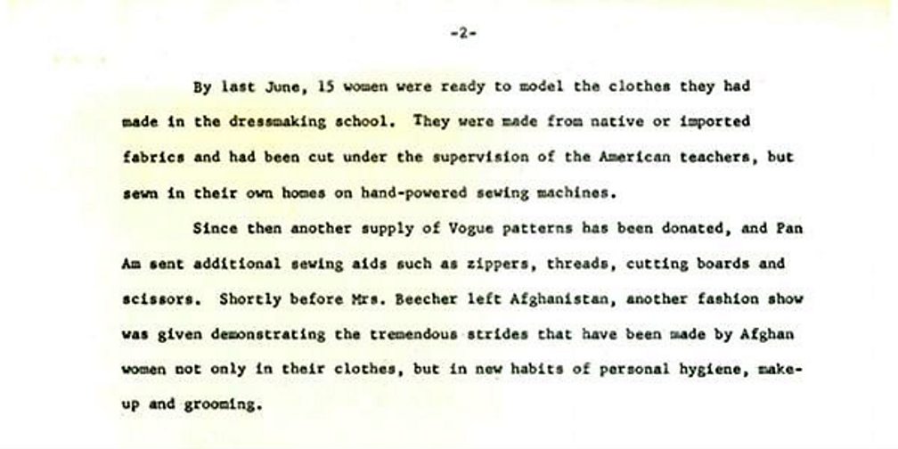 They were the wives of the American executives who ran the Afghan national airline, Ariana. Even the airline was part of the development project and it was owned and run by Pan American Airlines from San Francisco. The wives decided they would put on a fashion show to demonstrate to the Afghan women how to be truly modern
