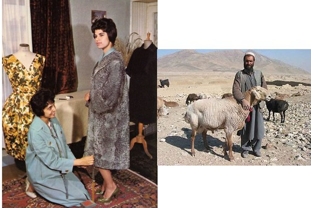 The fur trade in Europe which had been predominantly run by Jews was closed down. It moved to New York where there was a growing demand for astrakhan coats - made with the fur of fat-tailed sheep from Afghanistan. Here is a classic piece of Afghan promotion of their key export. And a fat tailed sheep.