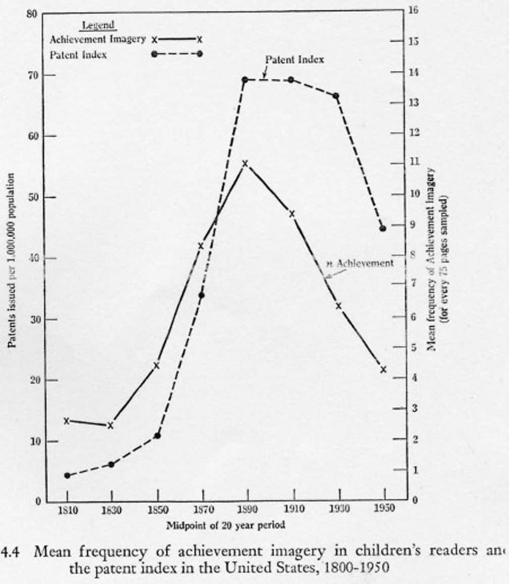 McClelland worked tirelessly to prove his case. Here is one of his diagrams that shows that the frequency of achieving imagery in children's books in the late 19th century leads inevitably to a rise in inventions in America as they grow up - as shown by the number of patented inventions.
