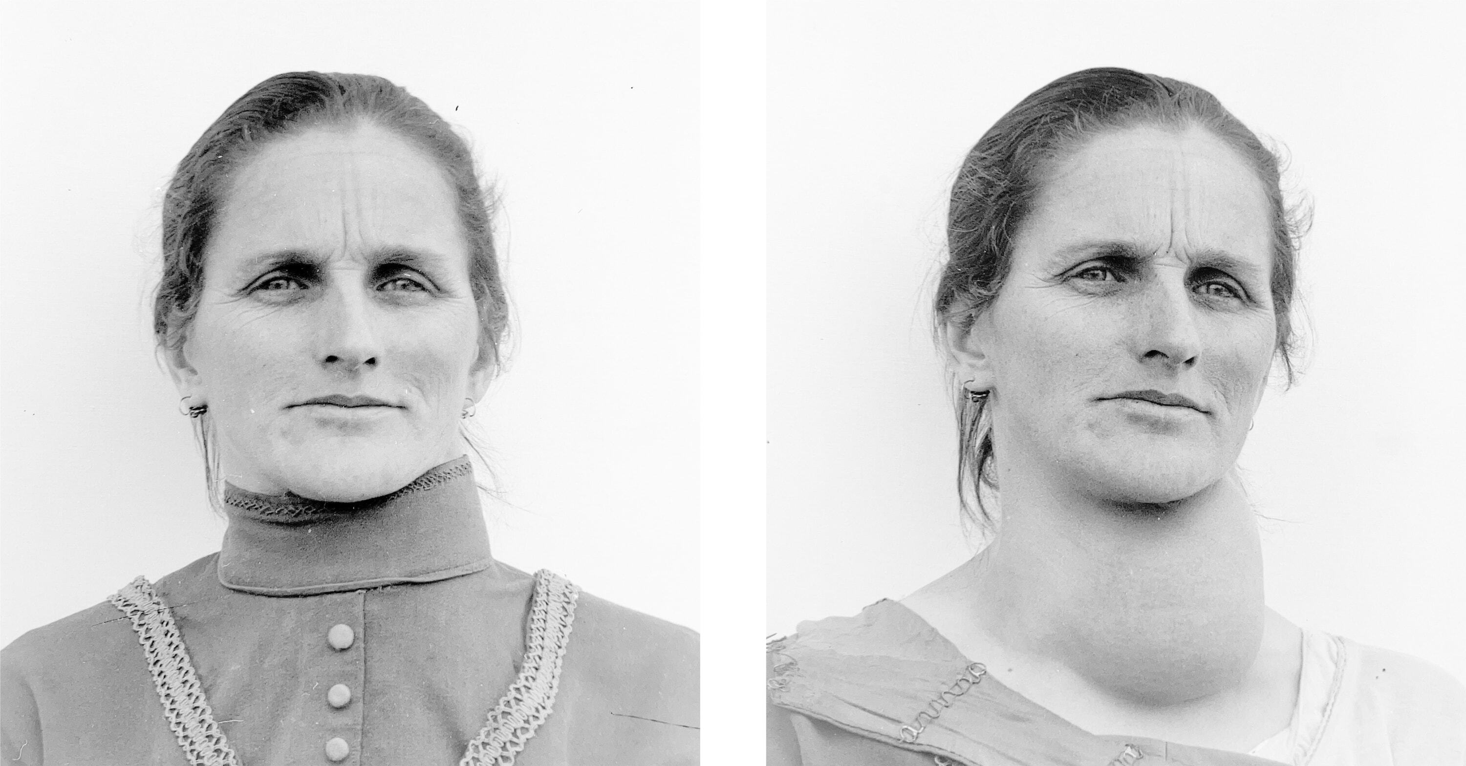 At the turn of the 20th century, the Swiss were plagued by strange, interlinked medical conditions, which existed elsewhere to a degree, but in Switzerland were endemic in more than 80 per cent of the country. It was a curse that had a mark: the goitre, a bulge of flesh protruding from the front of the neck, sometimes so large that it weighed on the windpipe, giving bearers a characteristic wheeze. It was often disguised by collars and high necklines, but its true extent is laid bare by conscription data. In 1921, nearly 30 per cent of 19-year-old Swiss conscripts had a goitre. In the cantons of Luzern and Obwalden, one in four men were exempt from military service as a result of goitres so large they struggled to breathe. For every man with a goitre, three women suffered from the condition. Children were the most vulnerable of all: in 1921, in the city of Bern, 94 per cent of schoolchildren had some swelling of the neck and almost 70 per cent had a goitre.