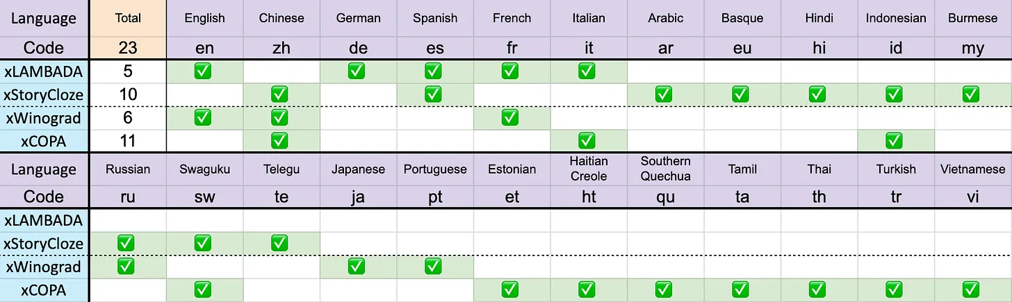 We performed multi-lingual performance across the following benchmarks: xLAMBDA, xStoryCloze, xWinograd, xCopa