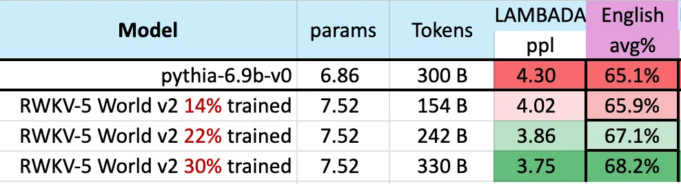 Once again we see a huge overall jump from RWKV v4-to-v5 architecture. And the v2 world dataset.