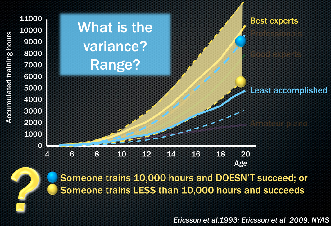 This 10,000 hour theory has its origins in a 1993 study by Ericsson, where he looked at the performance ability of violinists, and showed that the playing ability was determined by the cumulative hours of training up to the age of 20. That is, the best experts had accumulated the magic number of 10,000 hours whereas those classified as merely "good" or "least accomplished" were found to have done only 8,000 or 5,000 hours of practice, respectively. The graph below illustrates this main finding, where yellow and orange are the best performing violinists. Clearly, the average time taken to get to the 'elite' level is 10,000 hours, at least when it comes to playing a musical instrument: