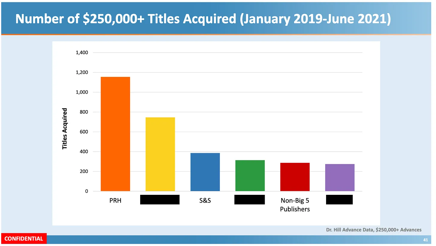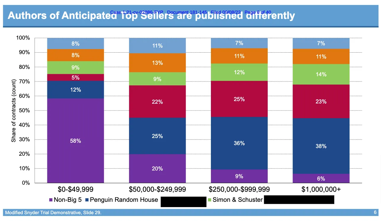 They spent a lot of the trial talking about books that made an advance of more than $250,000—they called these “anticipated top-sellers.” According to Nicholas Hill, a partner at Bates White Economic Consulting, 2 percent of all titles earn an advance over $250,000.
