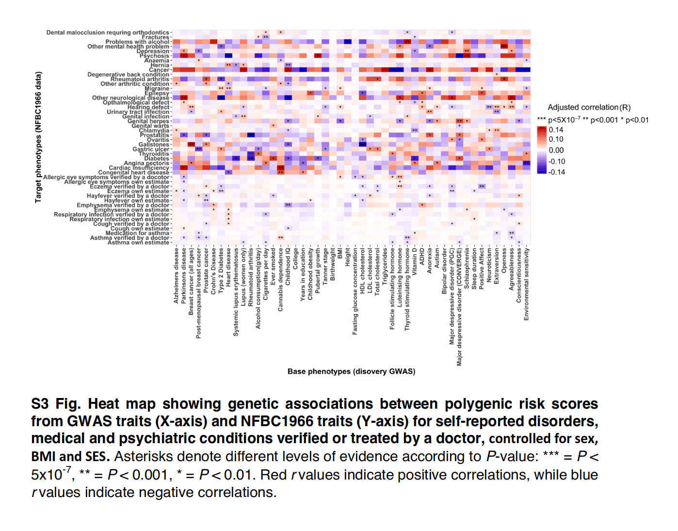 Socrates et al 2017: “Figure 3. Heat map showing genetic associations between polygenic risk scores from GWAS traits (x-axis) and NFBC196659ya traits (y-axis) from questionnaires lifestyle and social factors”