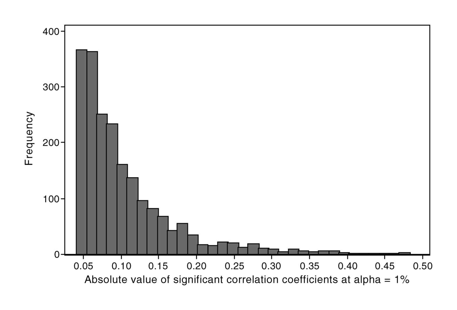 Many variables achieved “statistical-significance” and some effect-sizes approached or exceeded r = 0.10, despite little theoretical relevance between the variables.