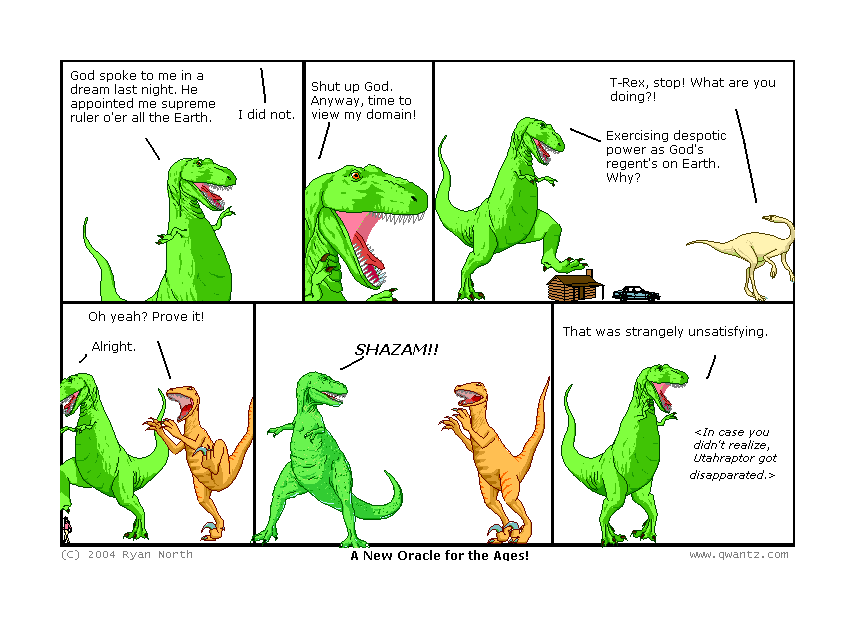 God spoke to me in a dream last night. He appointed me supreme ruler o’er all the Earth. / I did not. // Shut up, God. Anyway, time to view my domain! // T-Rex, stop! What are you doing‽ / Exercising despotic power as God’s regent on Earth. Why? // Oh yeah? Prove it! / Alright. // SHAZAM!! // That was strangely unsatisfying. / [In case you didn’t realize, Utahraptor got disapparated.] // (A New Oracle for the Ages!)