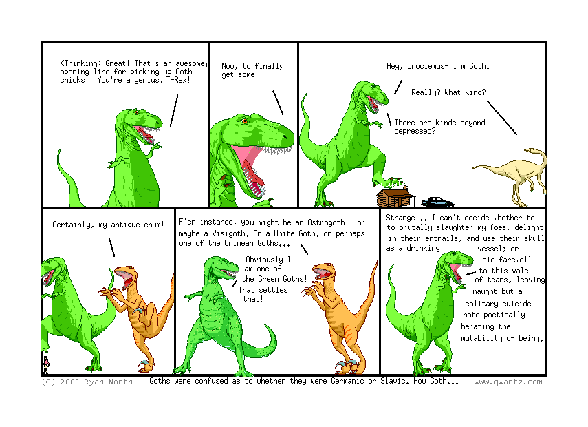 [Thinking] Great! That’s an awesome opening line for picking up Goth chicks! You’re a genius, T-Rex! // Now, to finally get some! // Hey, Drociemus—I’m Goth. / Really? What kind? / There are kinds beyond depressed? // Certainly, my antique chum! // F’er instance, you might be an Ostrogoth—or maybe a Visigoth. Or a White Goth, or perhaps one of the Crimean Goths… / Obviously I am one of the Green Goths! That settles that! // Strange… I can’t decide whether to brutally slaughter my foes, delight in their entrails, and use their skull as a drinking vessel; or bid farewell to this vale of tears, leaving naught but a solitary suicide note poetically berating the mutability of being. // (Goths were confused as to whether they were Germanic or Slavic. How Goth…)