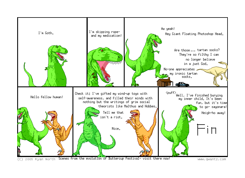 It’s been one week since Ryan and T-Rex reduced Utahraptor to cryin’ / Six days since Drociemus claimed his soul was dyin’ / And she wasn’t ain’t not lyin’ / Five days since we met the evil twin Bryan // But hold it, Ryan North / Watch this little short / Hope I avoid a copyright tort! / T-Rex has mad philosophical goods, / he’s from da hood! // Change your world-view, indeed he could! / He’s a rampaging madman / Stop him if you can / Shredder’s a huge fan! / See his polyamory? / Kinda scary / T-Rex’s so sexy / You’ll have to sign a wavier for paternity! // Your brain looks & starts tickin’ / You flip through the pages in syncopation! / Dinosaur Comic’s a sensation / No time to look at another // Holy cow—you see it last week? / There was this one freak / who kicked T-Rex’s idea inta next week! / In da beginning and da end / T-Rex’s all alone / sadly waiting for the non-existent phone /—C’mon, Ryan, toss’im a bone! // He’ll never get that dame / It’s a great shame / We’re all to blame / But what the hey? Y’all, keep on playing that game / just keep at playing out this game / a lot like Krazy Kat this is… / Hmm, this whole tribute is strangely unsatisfying. // (In Tribute to the Grand High Mugglewump of absurdism)