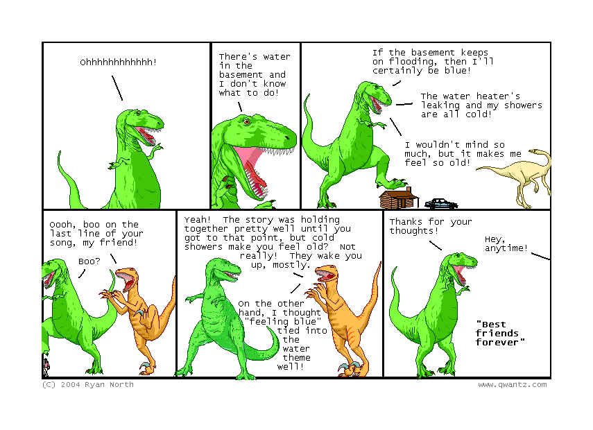 Ohhhhhhhhhhhh! // There’s water in the basement and I don’t know what to do! // If the basement keeps on flooding, then I’ll certainly be blue! / The water heater’s leaking and my showers are all cold! / I wouldn’t mind so much, but it makes me feel so old! // Ooh, boo on the last line of your song, my friend! / Boo? // Yeah! The story was holding together pretty well until you got to that point, but cold showers make you feel old? Not really! They wake you up, mostly. / On the other hand, I thought “feeling blue” tie into the water theme well! // Thanks for your thoughts! / Hey, anytime! / “BEST FRIENDS FOREVER”