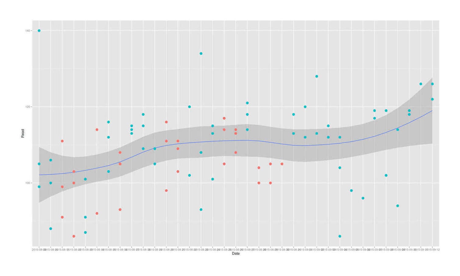 Another thing to notice in the plot is that blood glucose tests are both highly variable within a day, and highly variable between days as well. The variability between days implies that a multilevel model here would be good. The variability within days, on the other hand, implies that the different measurement times should be treated as covariates themselves, but also that we should remember that home blood glucose tests are not infinitely precise but the manufacturers claim an accuracy of something like ±5ng/ml (and in using my own blood glucose test strips, I find they can be much more noisy than that), so modeling the measurement-error would be worthwhile.