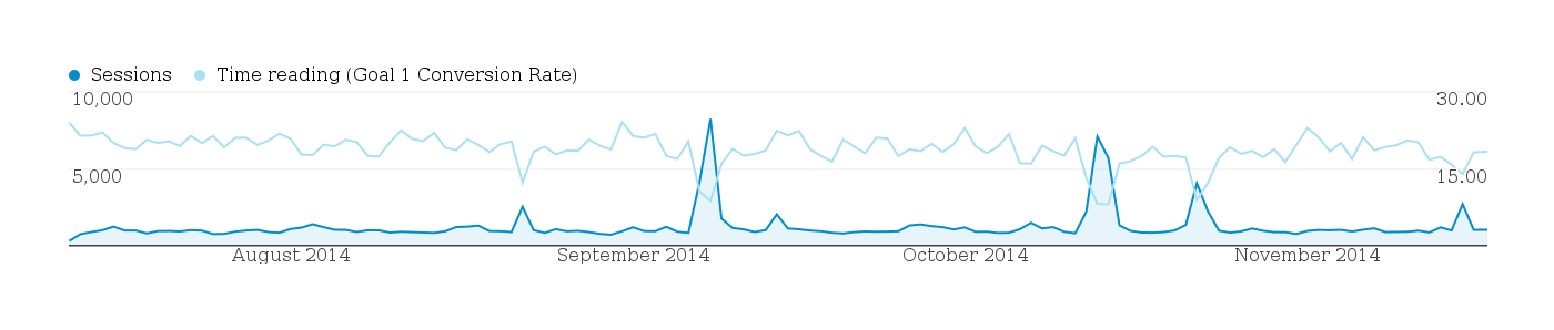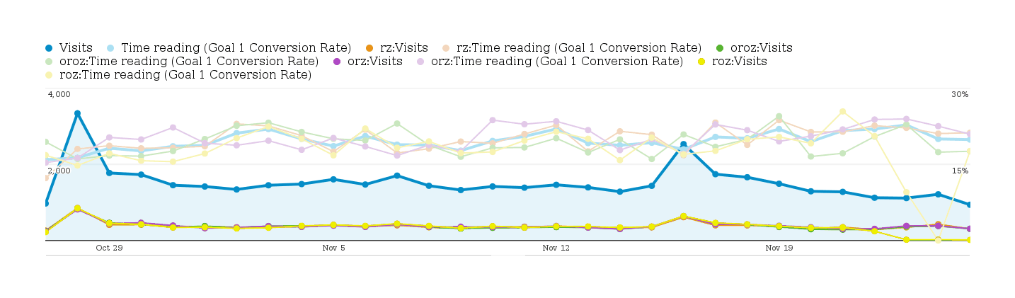 In March 201312ya, I decided to give A/B testing another whack. Google Analytics Experiment did not seem to have improved and the commercial services continued to charge unacceptable prices, so I gave the Google Analytics custom variable integration approach another trying using ABalytics. The usual puzzling, debugging, and frustration of combining so many disparate technologies (HTML and CSS and JS and Google Analytics) aside, it seemed to work on my test page. The current downside seems to be that the ABalytics approach may be fragile, and the UI in GA is awful (you have to do the statistics yourself).