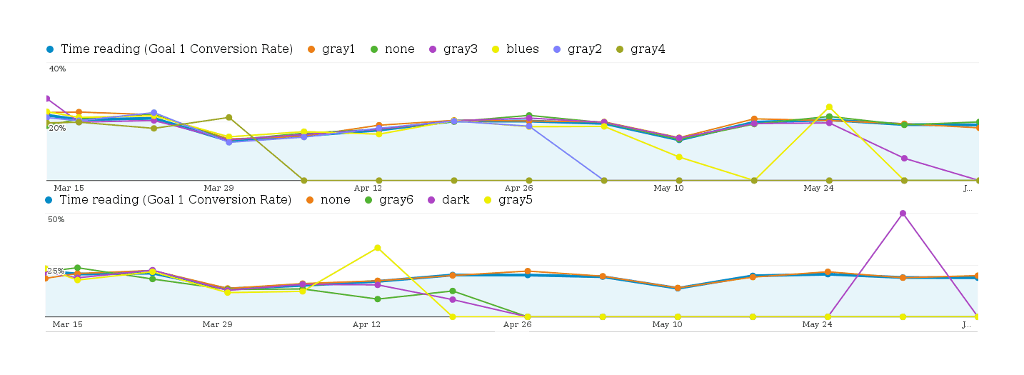 To gain some statistical & web development experience and to improve my readers’ experiences, I have been running a series of CSS A/B tests since June 201213ya. As expected, most do not show any meaningful difference.