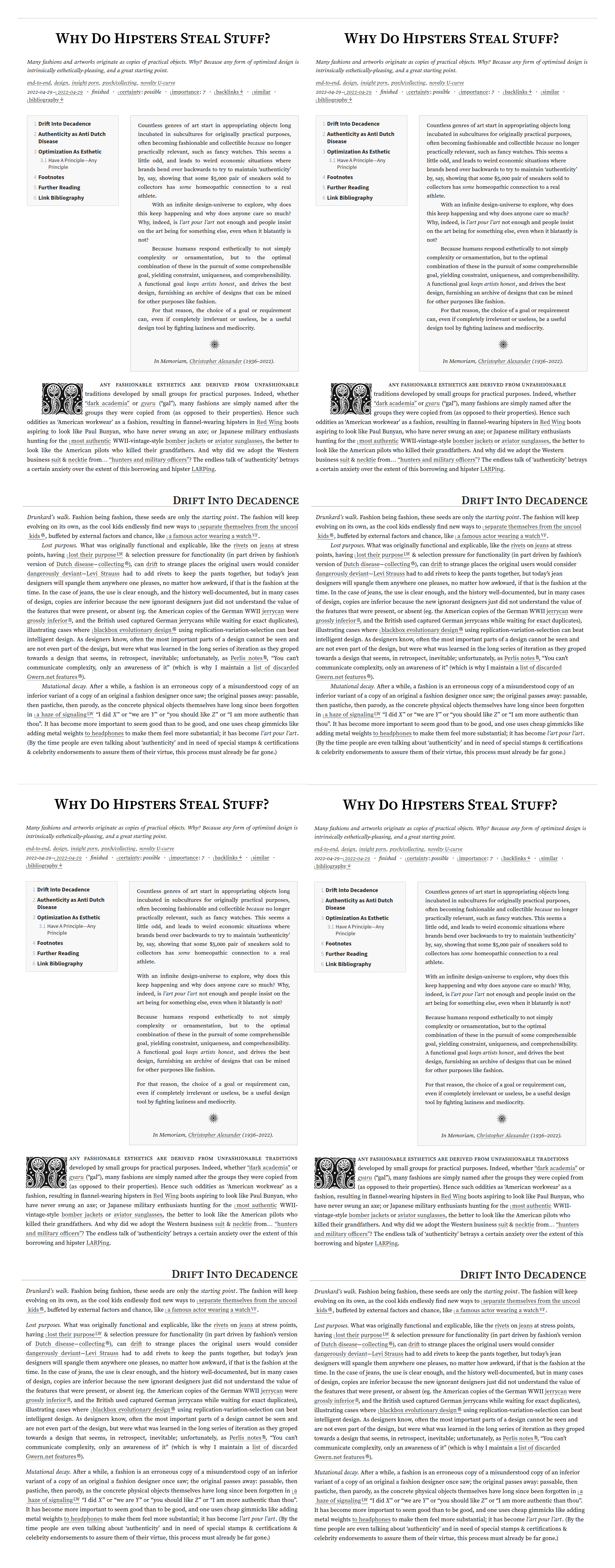 A log of experiments done on the site design, intended to render pages more readable, focusing on the challenge of testing a static site, page width, fonts, plugins, and effects of advertising.