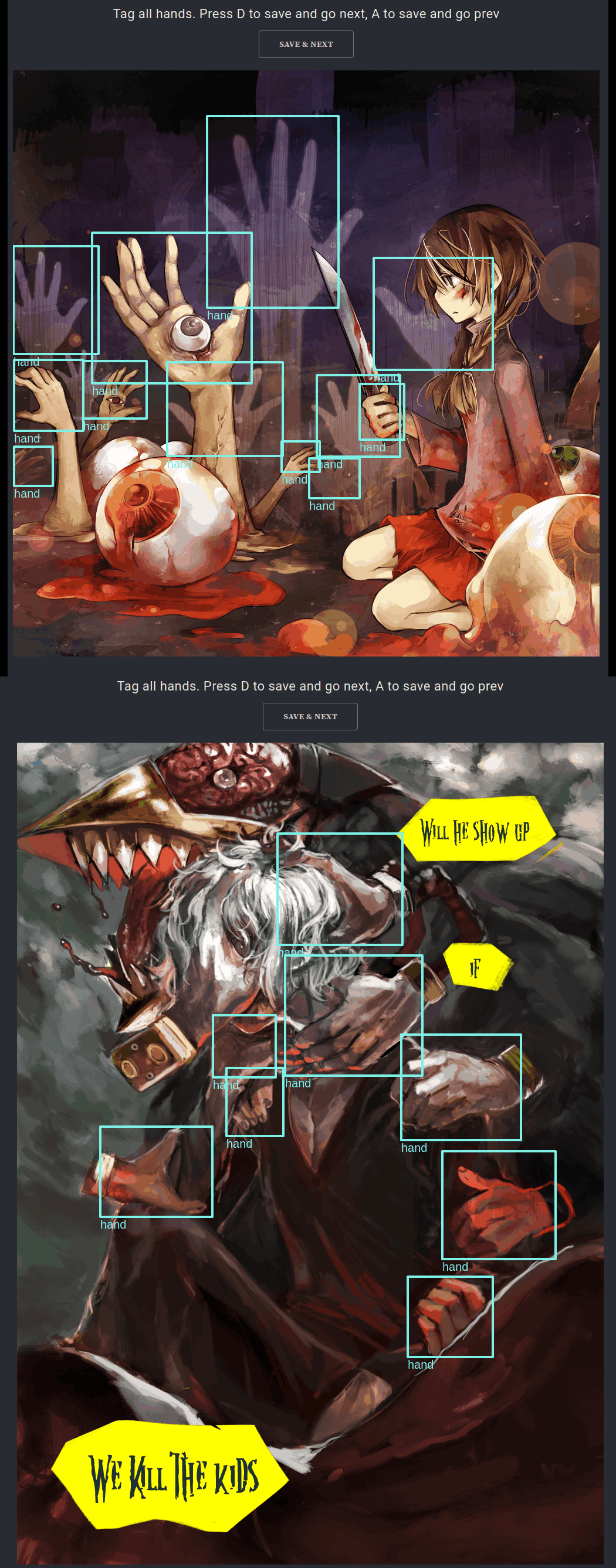 Custom Danbooru annotation website. Instead of using random Danbooru2019 samples, which might not have useful hands and would yield mostly ‘easy’ hands for training, we enriched the corpus by selecting the 14k images corresponding to hands rating:s: the Danbooru tag hands is used “when an image has a character’s hand(s) as the main focus or emphasizes the usage of hands.” All the samples had hands, in different locations, sizes, styles, and occlusions—although some samples were challenging to annotate: