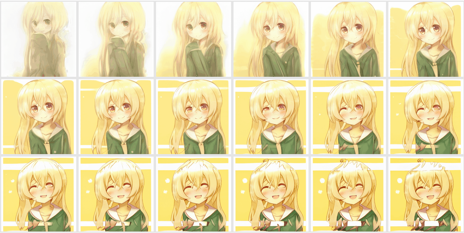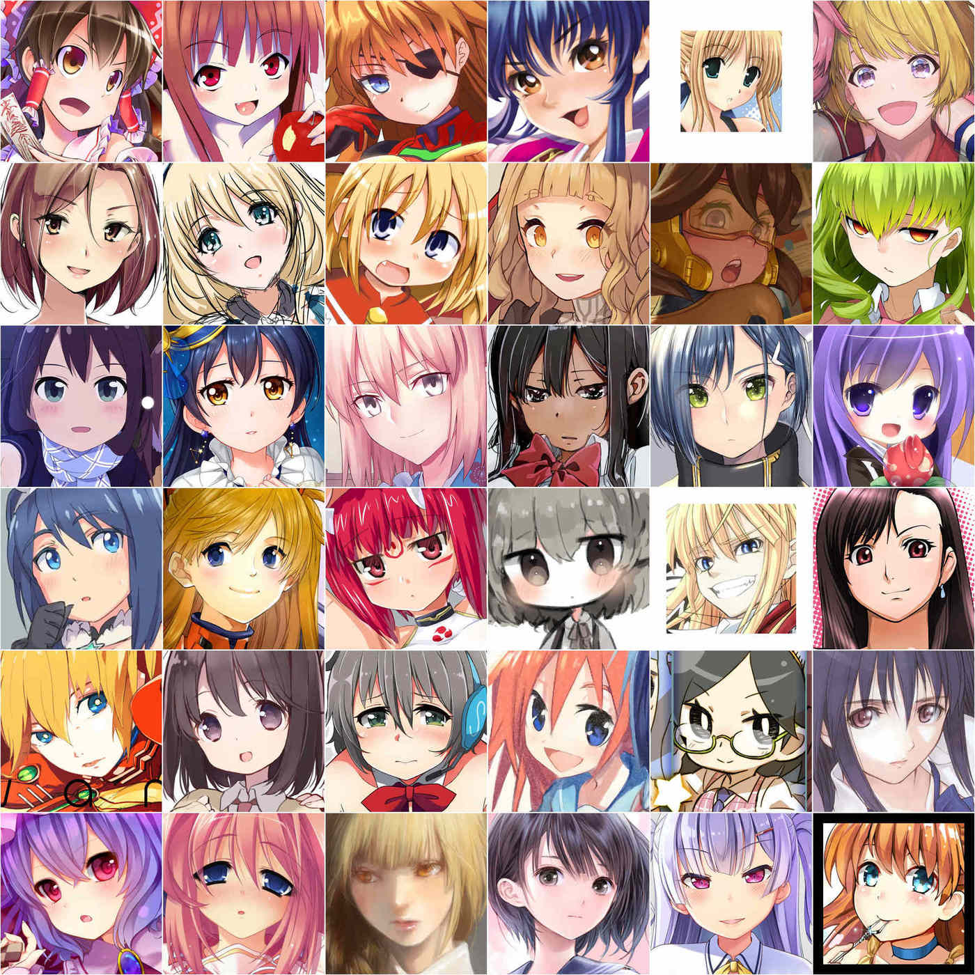 While some remarkable tools like PaintsTransfer/style2paints were created, and there were the occasional semi-successful anime face GANs like IllustrationGAN, the most notable attempt at anime face generation was Make Girls.moe ( et al 2017). MGM could, interestingly, do in-browser 256px anime face generation using tiny GANs, but that is a dead end. MGM accomplished that much by making the problem easier: they added some light supervision in the form of a crude tag embedding5, and then simplifying the problem drastically to n = 42k faces cropped from professional video game character artwork, which I regarded as not an acceptable solution—the faces were small & boring, and it was unclear if this data-cleaning approach could scale to anime faces in general, much less anime images in general. They are recognizably anime faces but the resolution is low and the quality is not great:
