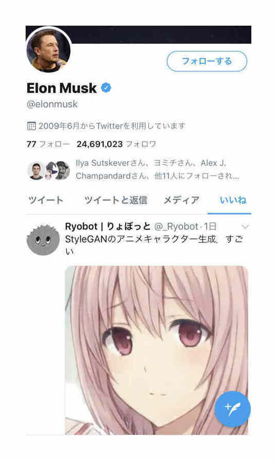 This has confused some people, so to clarify the sequence of events: I trained my anime face StyleGAN and posted notes on Twitter, releasing an early model; roadrunner01 generated an interpolation video using said model (but a different random seed, of course); this interpolation video was retweeted by the Japanese Twitter user _Ryobot, upon which it went viral and was ‘liked’ by Elon Musk, further driving virality (19k reshares, 65k likes, 1.29m watches as of 2019-03-22).↩︎