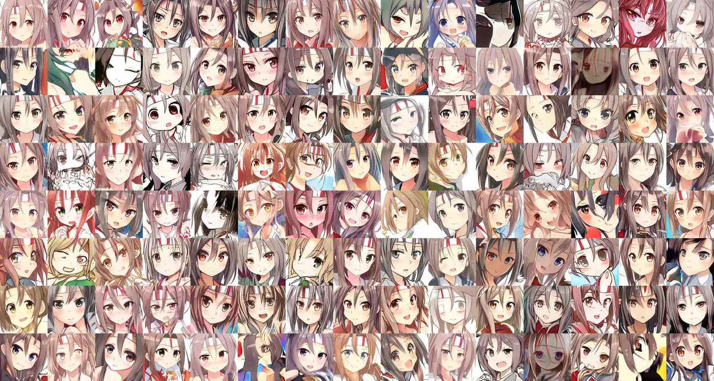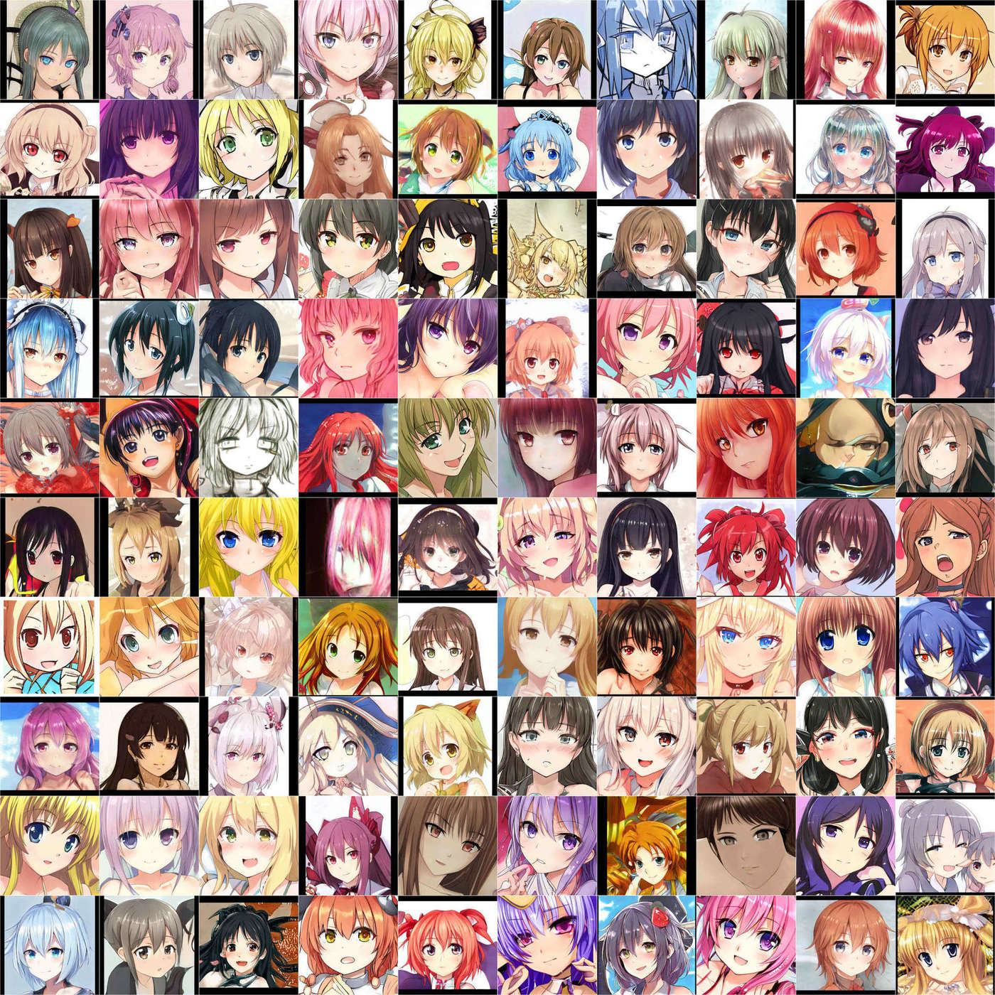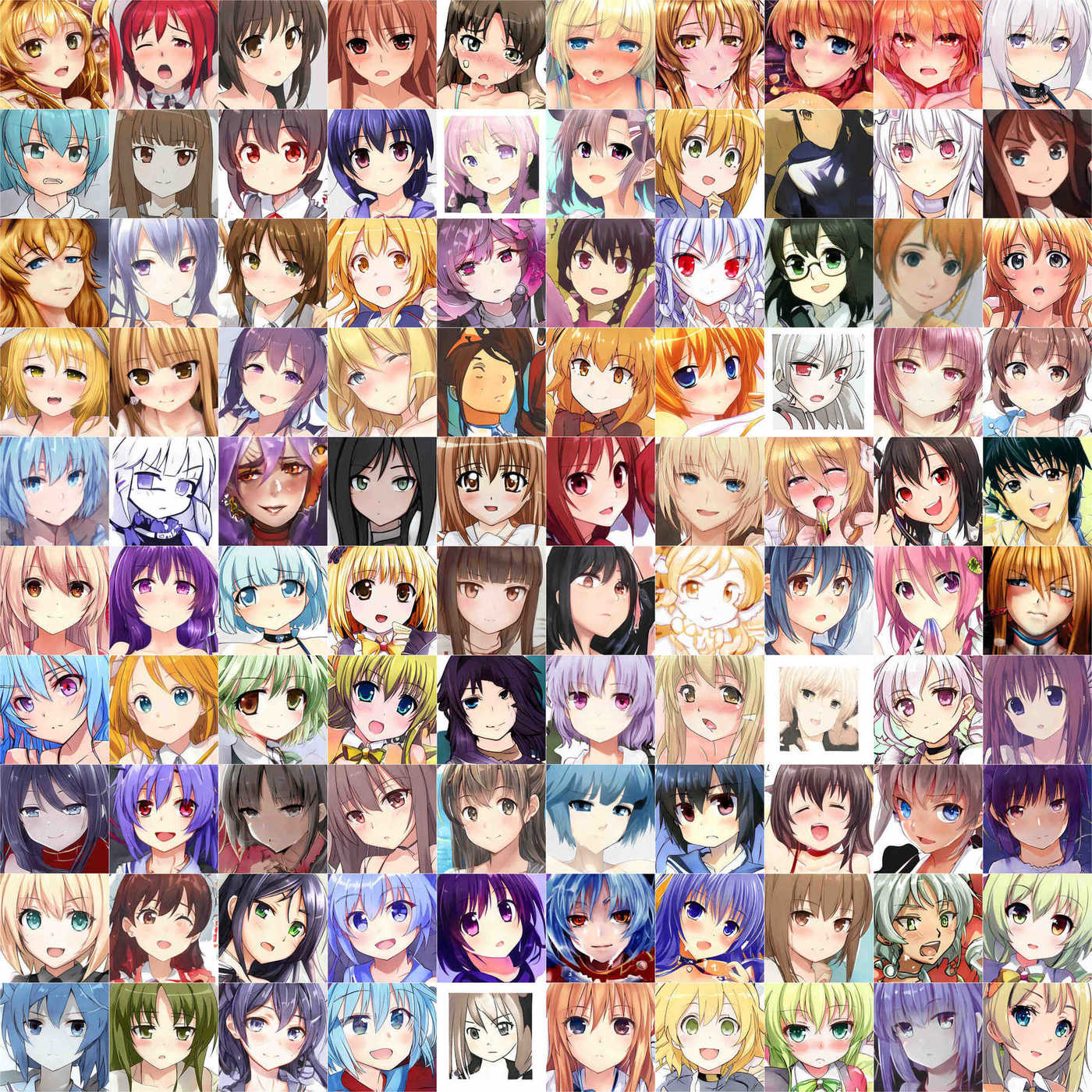 100 random sample images from the StyleGAN anime faces on TWDNE