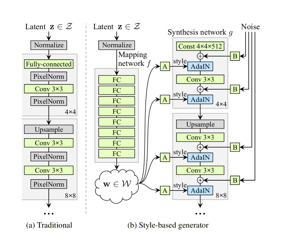 et al 2018, StyleGAN vs ProGAN architecture: “Figure 1. While a traditional generator [29] feeds the latent code [z] though the input layer only, we first map the input to an intermediate latent space W, which then controls the generator through adaptive instance normalization (AdaIN) at each convolution layer. Gaussian noise is added after each convolution, before evaluating the nonlinearity. Here”A” stands for a learned affine transform, and “B” applies learned per-channel scaling factors to the noise input. The mapping network f consists of 8 layers and the synthesis network g consists of 18 layers—two for each resolution (42-−10242). The output of the last layer is converted to RGB using a separate 1×1 convolution, similar to Karras et al. [29]. Our generator has a total of 26.2M trainable parameters, compared to 23.1M in the traditional generator.”