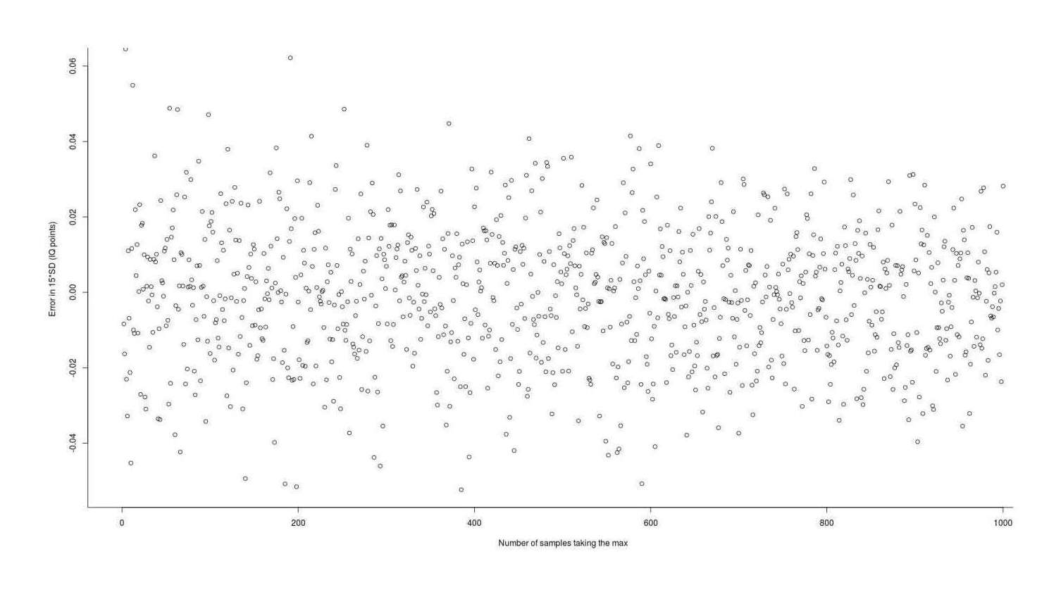 chen1999 <- function(n, sd=1){ qnorm(0.5264^(1/n), sd=sd) } approximationError <- sapply(1:1000, function(n) { (chen1999(n) - simGain(n)) * 15 }) summary(approximationError) # Min. 1st Qu. Median Mean 3rd Qu. Max. # −0.3801803 −0.3263603 −0.3126665 −0.2999775 −0.2923680 0.9445290 plot(1:1000, approximationError, xlab="Number of samples taking the max", ylab="Error in 15*SD (IQ points)")