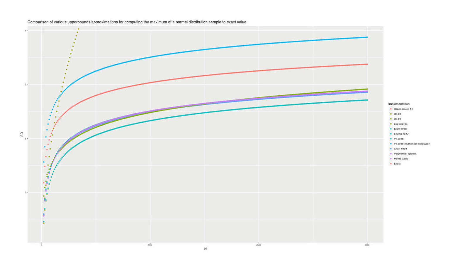 evNormOrdStatsScalarcomputes the value of 𝔼(r,n) for user-specified values of r and n. The functionevNormOrdStatscomputes the values of 𝔼(r,n) for all values of r for a user-specified value of n. For large values of n, the functionevNormOrdStatswithapproximate=FALSEmay take a long time to execute. Whenapproximate=TRUE,evNormOrdStatsandevNormOrdStatsScalaruse the following approximation to 𝔼(r,n), which was proposed by Blom (195867ya, pp. 68–75, [“6.9 An approximate mean value formula” & formula 6.10.3–6.10.5]):## General Blom 1958 approximation: blom1958E <- function(r,n) { qnorm((r - 3/8) / (n + 1/4)) } blom1958E(10^10, 10^10) # [1] 6.433133208This approximation is quite accurate. For example, for n ≥ 2, the approximation is accurate to the first decimal place, and for n ≥ 9 it is accurate to the second decimal place.