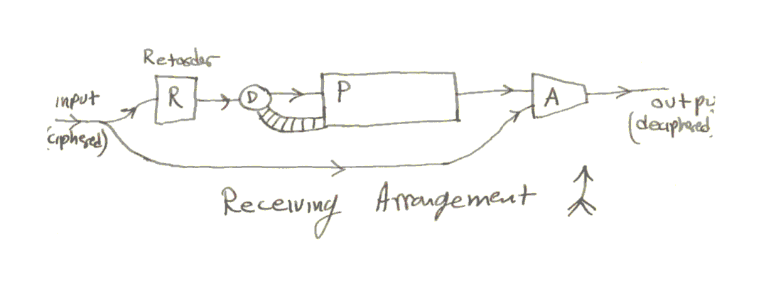 [pg14] So the adder A in the receiver gets: (1) the out-put of A in the transmitter, and (2) the previous input from P(trans.) to A(trans). Now since binary addition is the same as binary subtraction (ie. + & - mod 2 are the same) the output of A(receiv.) will be the previous input to A(trans.) From the input to the transmitter, ie. it will be the clear or unciphered message.