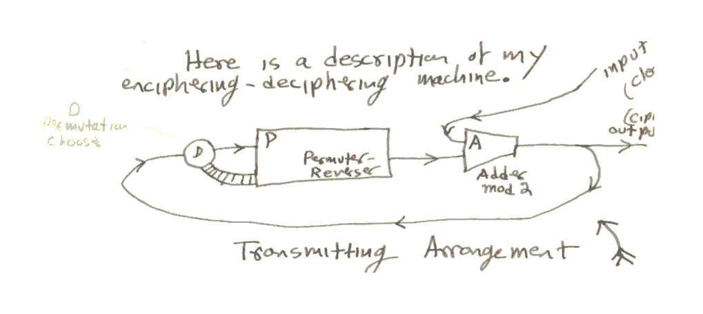 I believe the enciphering-deciphering machine I invented and had transmitted to the N.S.A. via RAND has this “unbreakable” property. In addition it has several other advantages in that [pg9] the same physical machine would function both for ciphering and deciphering and that it is auto-synchronizing and recovers after isolated errors in transmission. These properties are not typical of enciphering systems which are auto-coding. Also it is suitable for an all electronic, ultra rapid, embodiment.