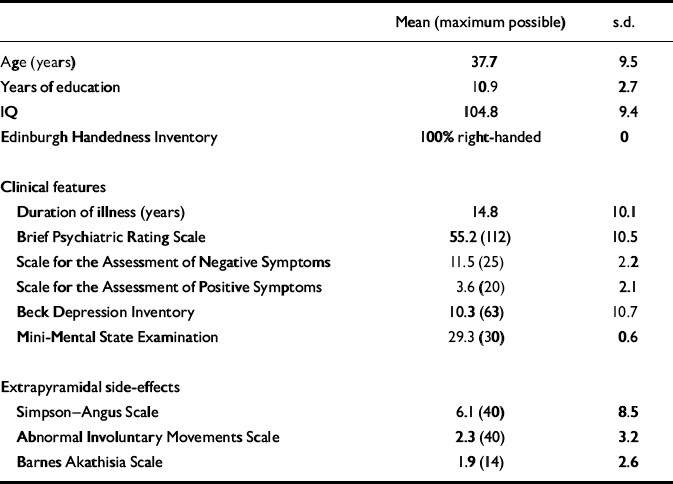 Thirty-two patients were approached and 21 agreed to participate following a full explanation of the study. Nineteen of these satisfied detailed assessment of the inclusion and exclusion criteria. Participants underwent psychiatric (Brief Psychiatric Rating Scale; Reference Overall and GorhamOverall & Gorham, 1962; SANS; Scale for the Assessment of Positive Symptoms; Reference AndreasenAndreasen, 1984; Beck Depression Inventory; Reference Beck, Ward and MendelsonBeck et al, 1961; Mini-Mental State Examination; Reference Folstein, Folstein and McHughFolstein et al, 1975), physical (including an electrocardiogram) and neuropsychological assessment (Simpson-Angus Scale; Reference Simpson and AngusSimpson & Angus, 1970; Abnormal Involuntary Movements Scale; Reference GuyGuy, 1976; Barnes Akathisia Scale; Reference BarnesBarnes, 1989).